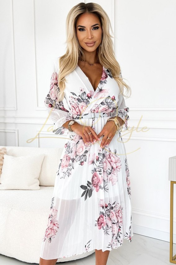 YUNA Plisowana sukienka midi z dekoltem i paskiem RÓŻE na białym tle