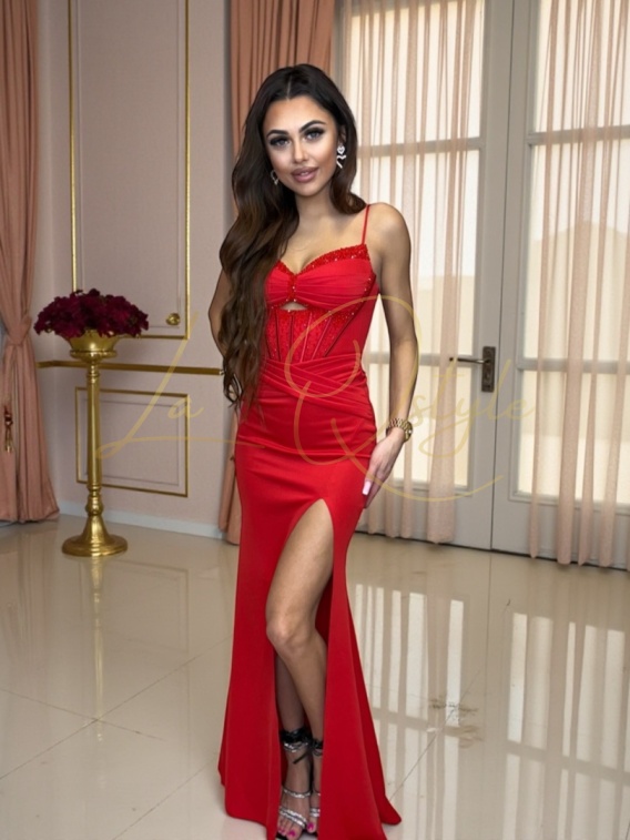 Gorset zdobiony kryształkami nadaje tej sukience niepowtarzalnego blasku i elegancji. Głębokie rozcięcie na nodze dodaje całości nuty zmysłowości, podkreślając jednocześnie subtelnie nogi. Sukienka jest wiązana na plecach, co pozwala dostosować jej dopasowanie do Twoich indywidualnych preferencji. Usztywniane miseczki zapewniają odpowiednie wsparcie biustowi, gwarantując komfort noszenia przez całą noc.
