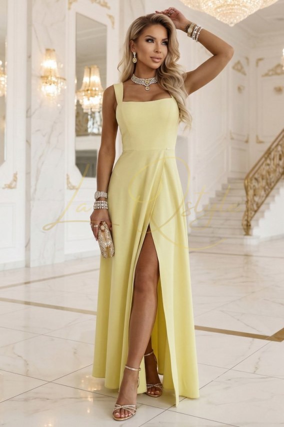 AURELIA długa sukienka na wesele z rozcięciem i dekoltem w caro MASEŁKOWY ŻÓŁTY Z BROKATEM
