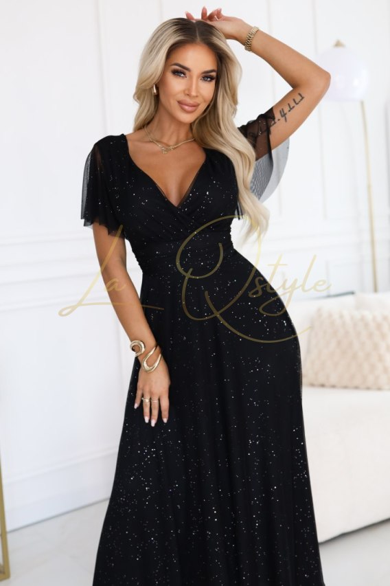 Elegancka długa sukienka wieczorowa w kolorze czarnym to propozycja marki Numoco Basic, stworzona z myślą o wyjątkowych okazjach. Błyszczący materiał z delikatnym brokatowym wykończeniem pięknie odbija światło, dodając kreacji niepowtarzalnego uroku. Dekolt w kształcie litery V subtelnie podkreśla biust, a lekkie, zwiewne rękawki dodają całości lekkości i elegancji.
