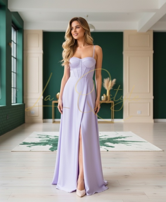 EMMA długa sukienka satynowa z rozcięciem i gorsetem LILA
