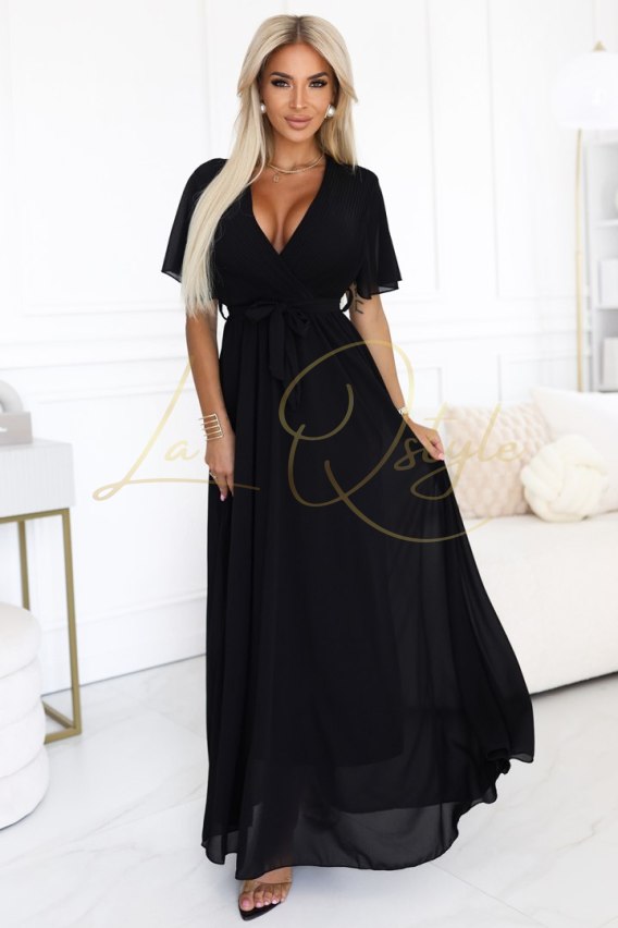 Stylowa i kobieca sukienka maxi w klasycznym czarnym kolorze to propozycja idealna na wyjątkowe okazje. Górna część została efektownie wykończona plisowanym dekoltem kopertowym, który subtelnie podkreśla biust i dodaje sylwetce lekkości.