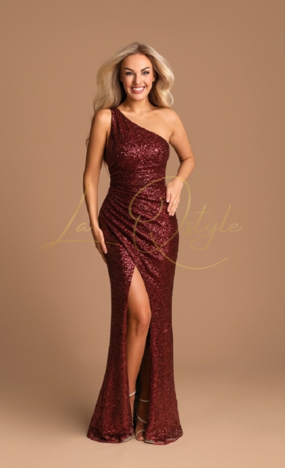 SOLANGE dopasowana cekinowa sukienka na jedno ramię BORDOWA