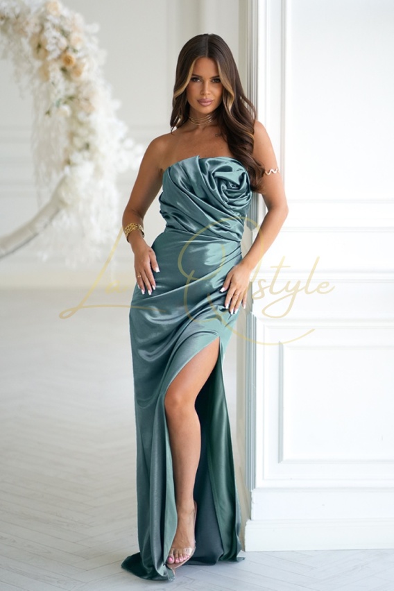 KATIA dopasowana długa sukienka z różą i wiązaniem na plecach SZAŁWIA