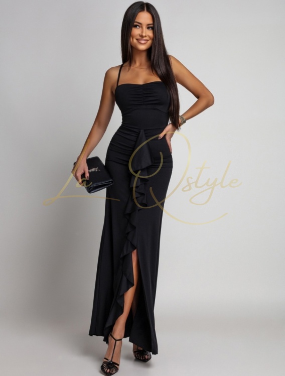 HAJAR dopasowana maxi sukienka z falbanami i rozcięciem CZARNA