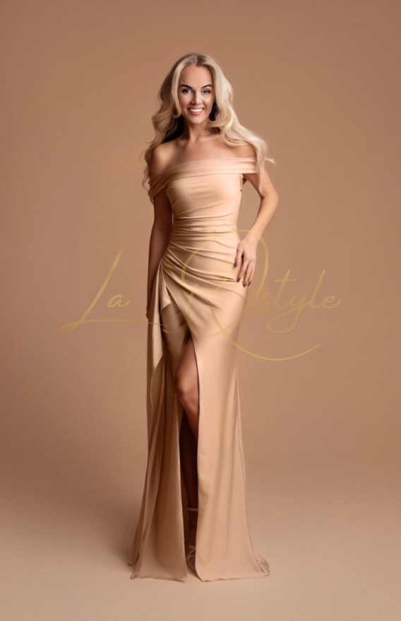 MAGALIE dopasowana sukienka z gorsetem, marszczeniami i opadającymi ramionami ZŁOTA