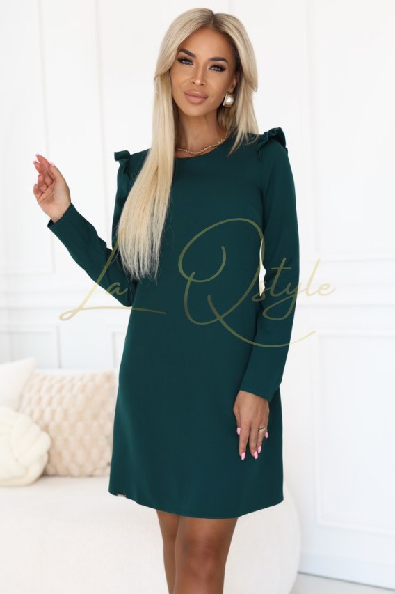Elegancka sukienka damska w kolorze butelkowej zieleni to propozycja dla kobiet, które cenią klasę i wygodę. Minimalistyczny krój został urozmaicony delikatnymi falbankami na ramionach, dodając stylizacji subtelnego uroku. Długi rękaw i prosty fason czynią ją idealną na wiele okazji - zarówno do pracy, jak i na uroczyste wyjścia.