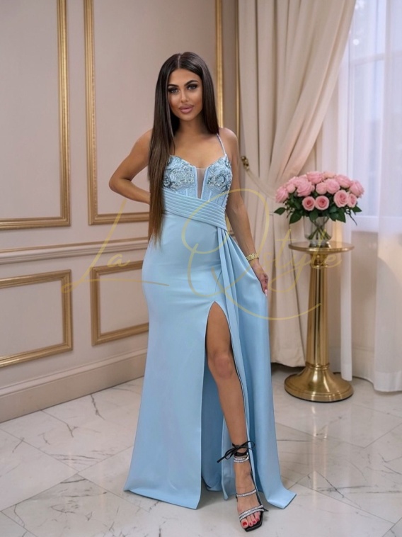IMMER dopasowana długa sukienka z ozdobnym gorsetem i trenem BŁĘKITNA