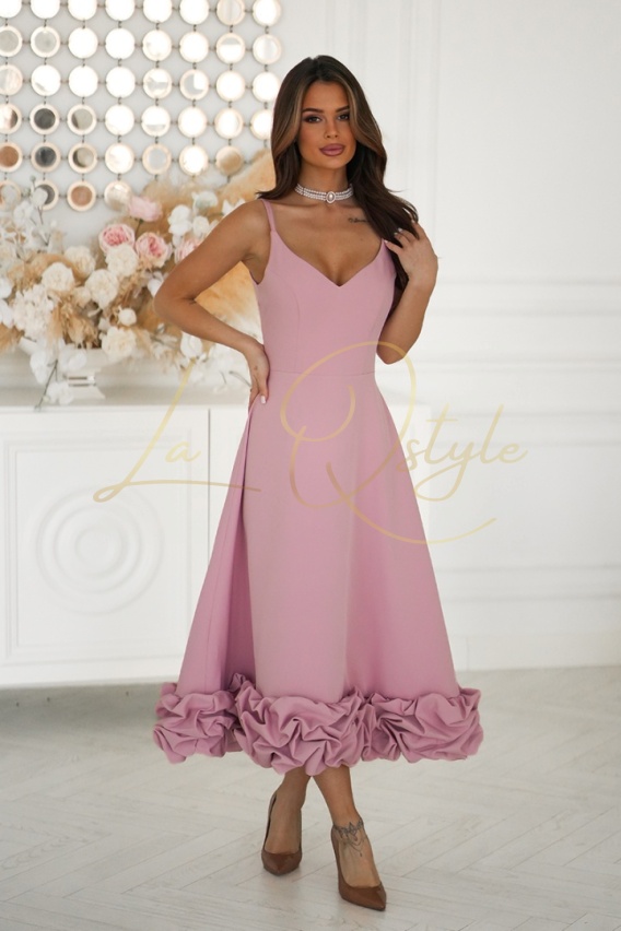 ROZALIA FALBANA rozkloszowana sukienka midi z falbaną PUDROWY RÓŻ