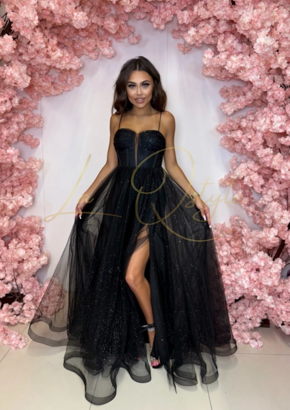 SHIBA balowa błyscząca sukienka tiulowa z gorsetem księżniczka CZARNA